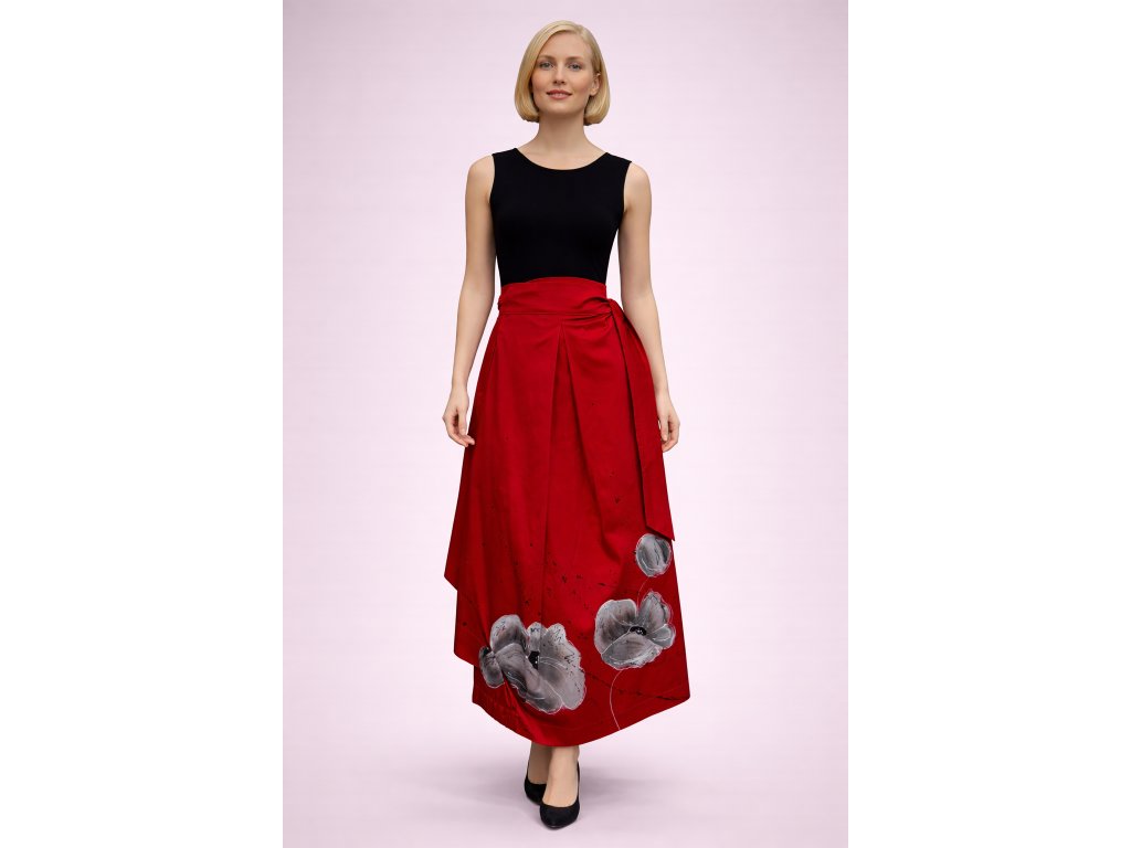 Ručne maľovaná balónová zavinovacia sukňa zo 100 % bavlny so saténovým finišom. Originálny zavinovací strih s balónovým efektom krásne formuje postavu, prispôsobí sa veľkostiam 36 – 42 a poskytuje maximálne pohodlie. Sukňa má praktické vrecká a jedinečnú ručnú maľbu.