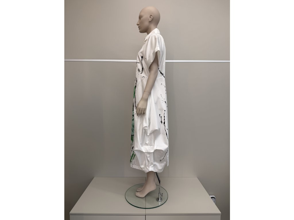 Dominantou šiat je ručná maľba s výrazným umeleckým motívom, vďaka ktorej je každý kus originál – žiadne dve šaty nie sú úplne rovnaké. Oversize strih v kombinácii s balónovou siluetou spodnej časti vytvára moderný, dizajnový tvar, ktorý lichotí postave a zároveň poskytuje maximálne pohodlie.