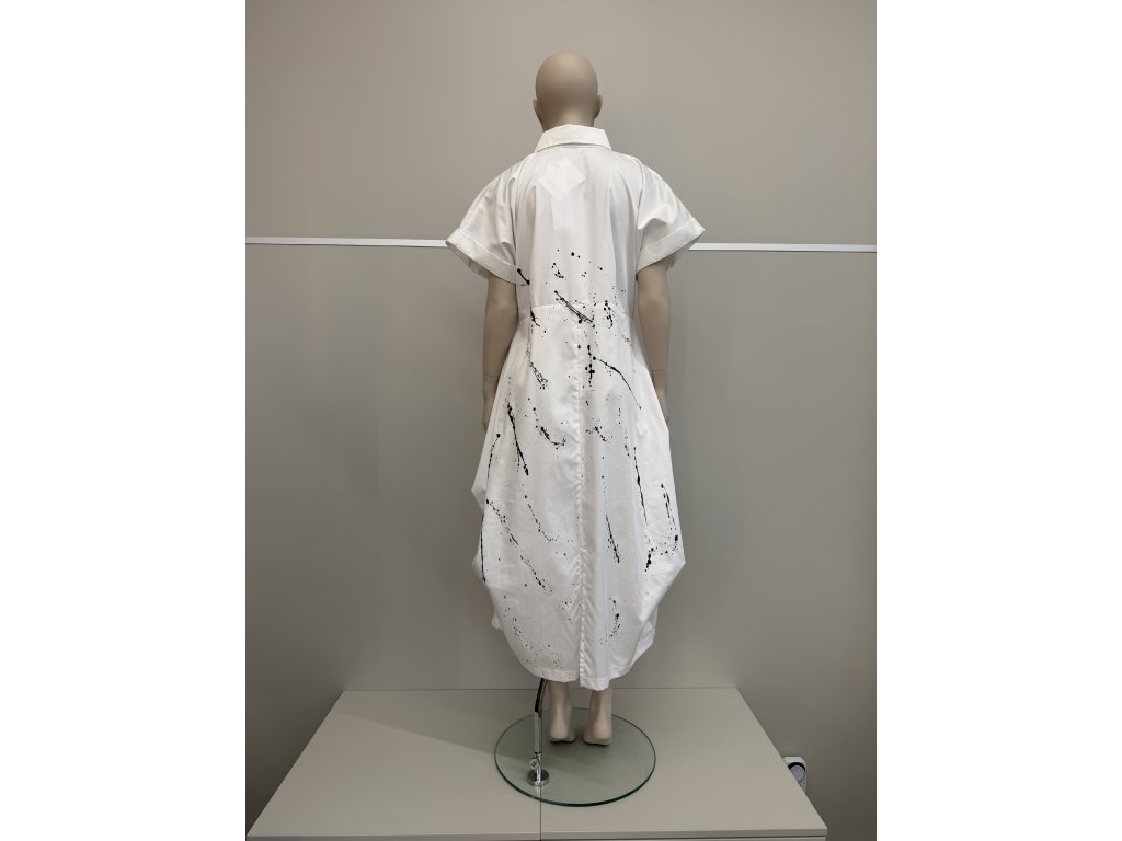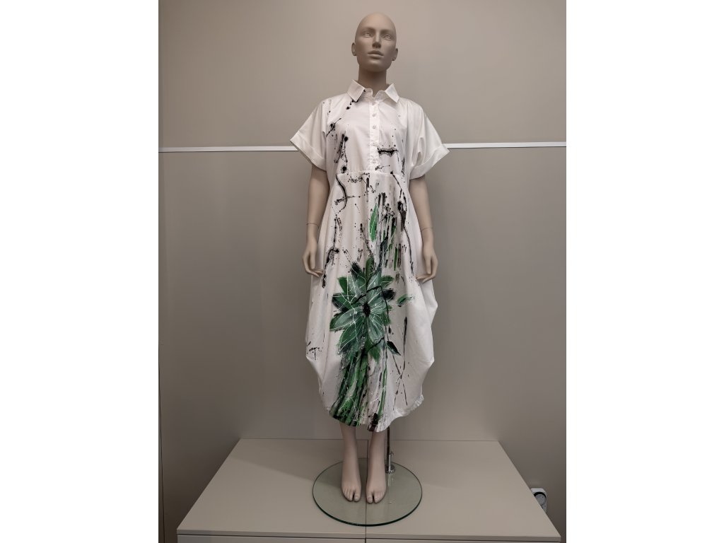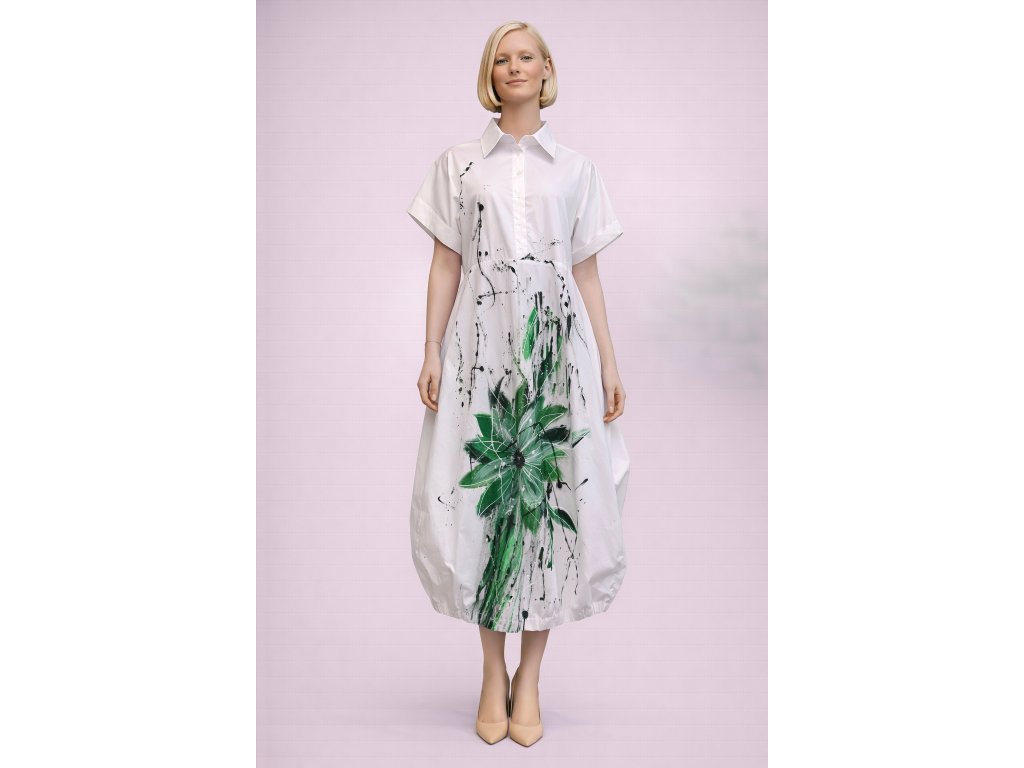 Oversize košeľové šaty z 100 % bavlny so saténovým finishom, ručne maľované, s balónovým strihom a umeleckým motívom. Výnimočný dizajnový kúsok, ktorý spája pohodlie, eleganciu a originalitu v jednom.