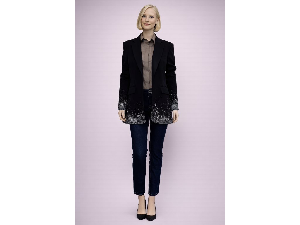 Štýlové dámske sako v pánskom strihu, ktoré svojou siluetou dodá outfitu sebavedomie a eleganciu. V spodnej časti je zdobené originálnou ručnou maľbou doplnenou Swarovski kryštálmi, ktoré jemne odrážajú svetlo. Vzadu nájdete variabilné stiahnutie, vďaka ktorému si viete prispôsobiť tvarovanie pásu podľa seba – voľné alebo viac ženské zvýraznenie siluety.