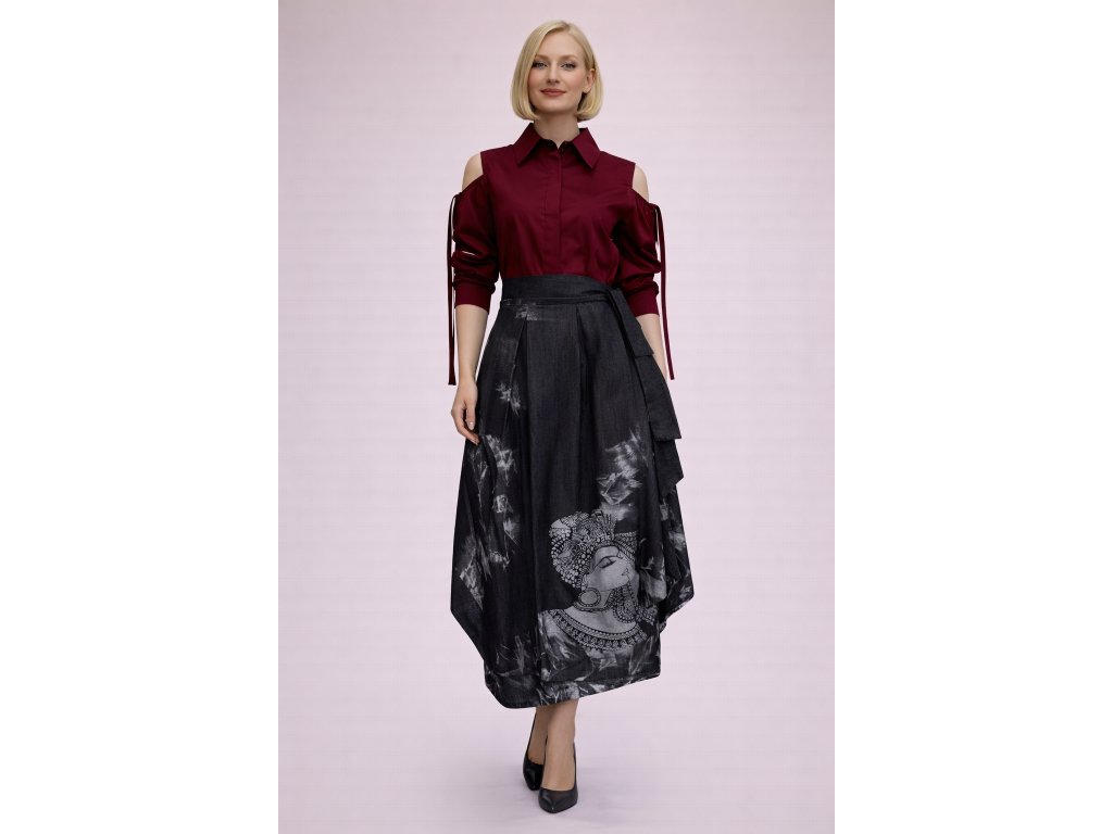Výnimočný kúsok, ktorý spája módu s umením. Táto zavinovacia sukňa z príjemného, tenkého denimu očarí originálnou ručnou maľbou kráľovskej tváre s bohatým ornamentom. Každý detail bol vytvorený ručne – a preto je každá sukňa jedinečná.