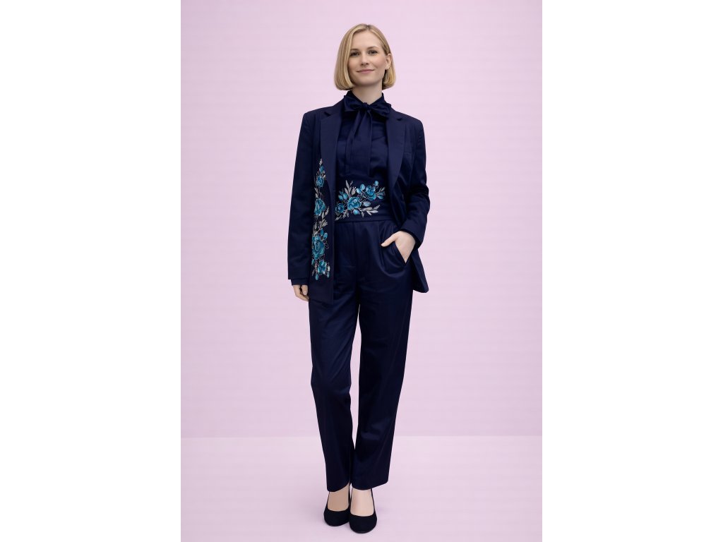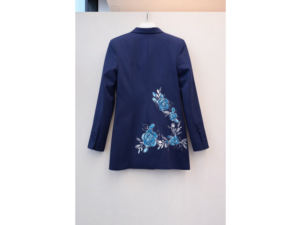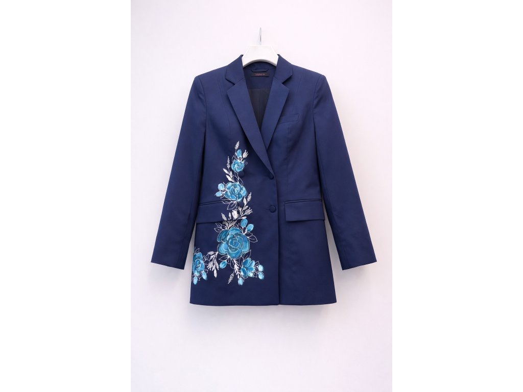 Elegantné sako v pánskom, predĺženom strihu zo 100 % bavlny so saténovým finišom. Ručná maľba v modrých tónoch robí z každého kusu originál. Nadčasový kúsok, ktorý povýši každý outfit.