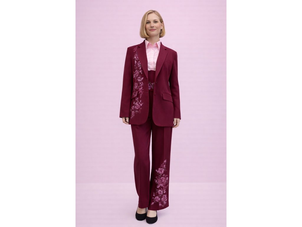 Malinová farba dodáva nohaviciam ženskosť a hĺbku, zatiaľ čo ručná maľba s jemným kvetinovým motívom robí z každého kusu originál. Voľný, široký strih lichotí postave, poskytuje maximálne pohodlie a elegantný pohyb pri chôdzi.