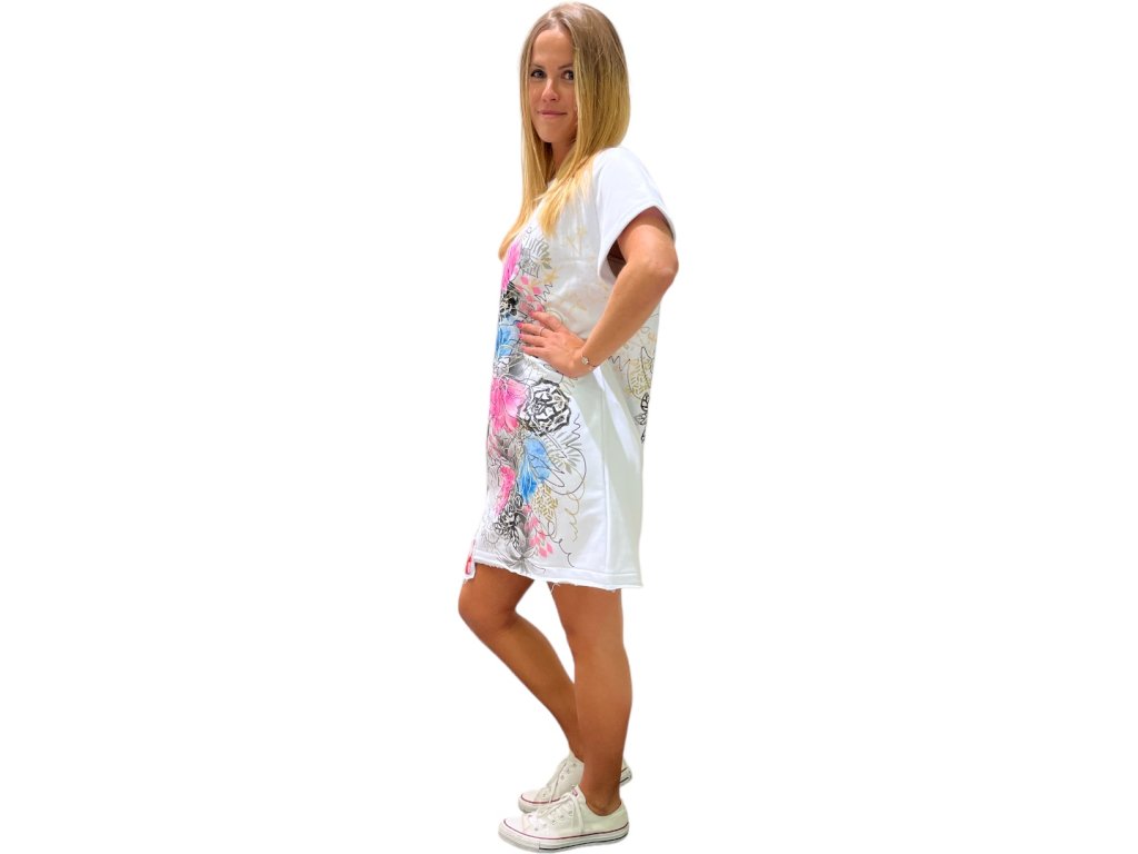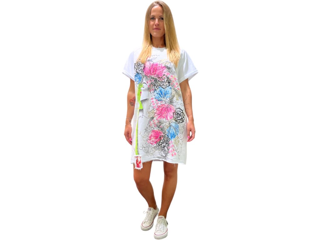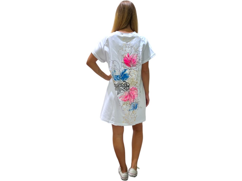 Jedinečné ručne maľované, mikinové šaty.  Tenká mikinovina je aj v lete vhodná na nosenie, pretože je priedušná. 100% bavlna je príjemná na nosenie. Vhodné na každodenné nosenie. Možno prať na 30 stupňov.