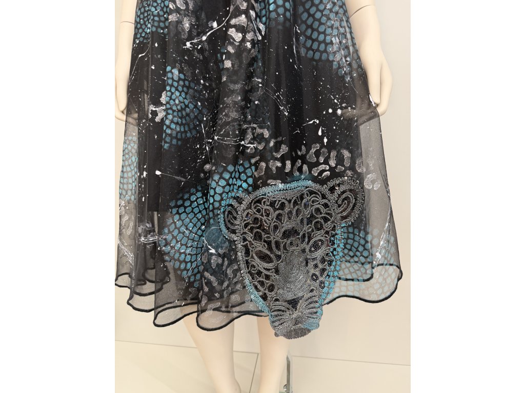 Elegantná tylová sukňa s ručnou maľbou, doplnená výraznou striebornou výšivkou motívu leoparda, ktorá dodáva modelu silný a moderný charakter. Kombinácia jemného tylu a umeleckého spracovania vytvára originálny kúsok, ktorý zaujme na prvý pohľad.