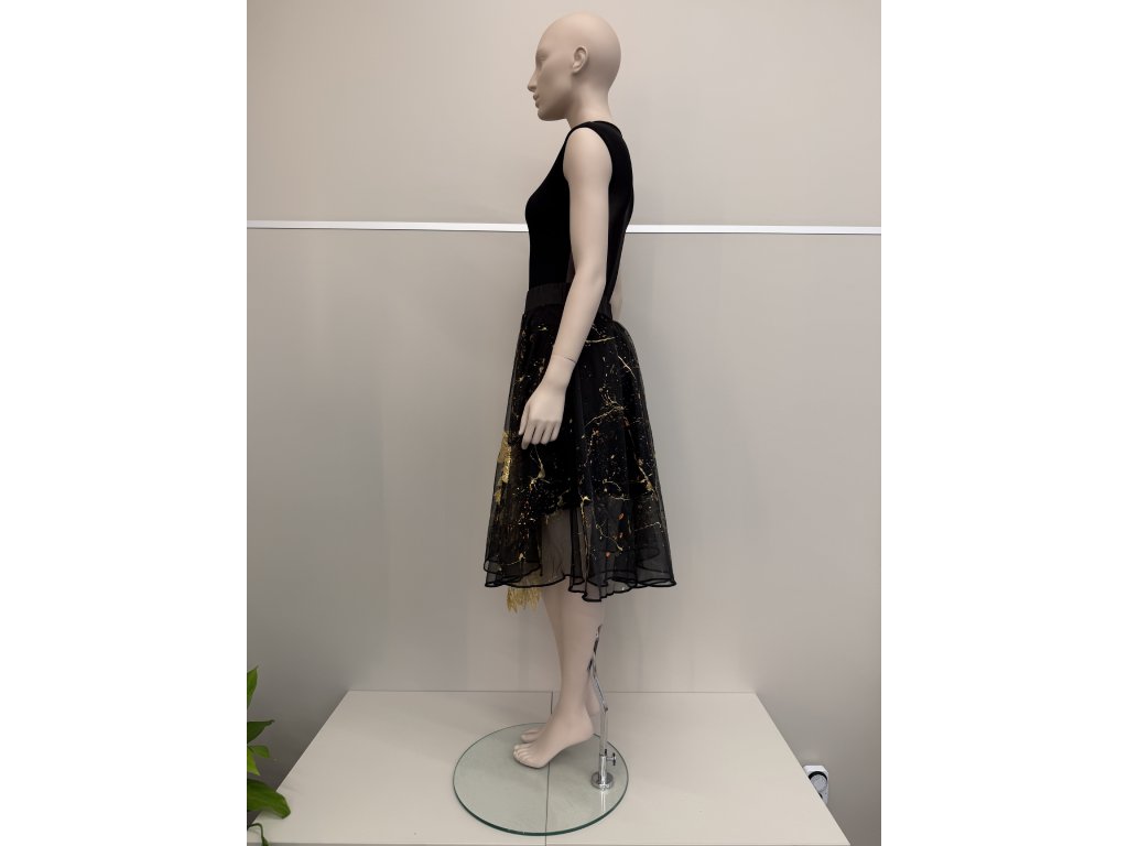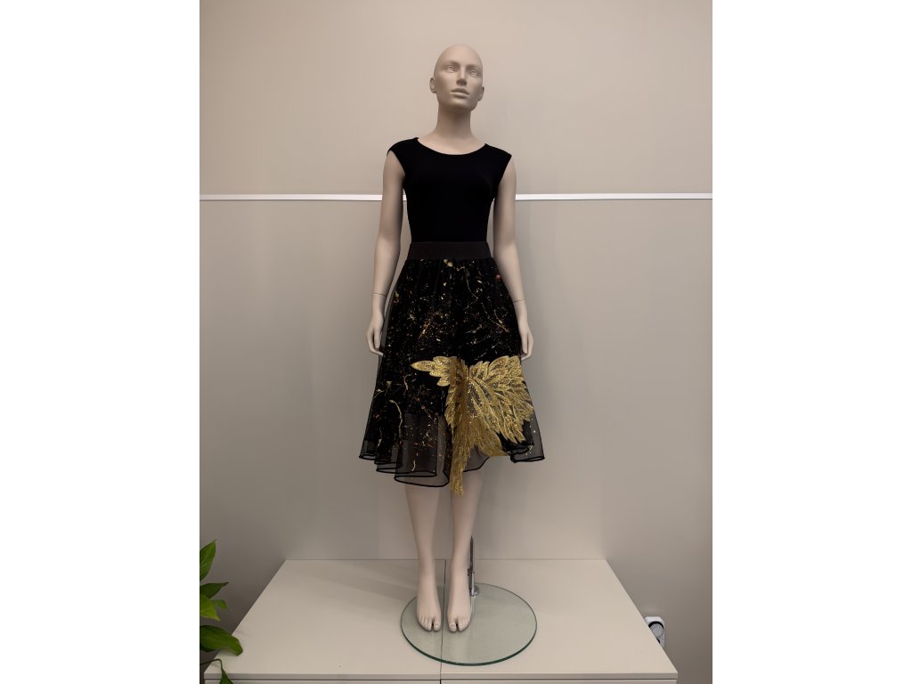 Elegantná tylová sukňa s ručnou maľbou, doplnená výraznou zlatou výšivkou. Má funkčnú podšívku a jemný elastický pás, ktorý sa pohodlne prispôsobí postave.