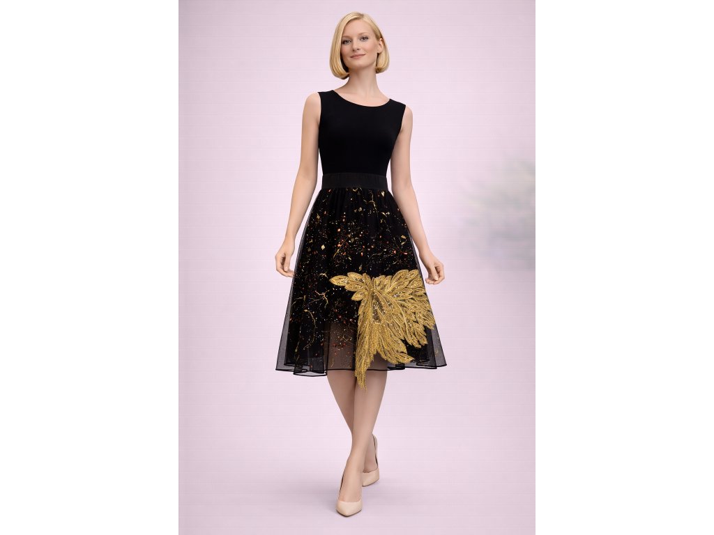 Elegantná tylová sukňa s ručnou maľbou, doplnená výraznou zlatou výšivkou, ktorá dodáva modelu jedinečný a luxusný charakter. Ľahký tyl pôsobí vzdušne a žensky, zatiaľ čo funkčná podšívka zabezpečuje pohodlné nosenie.